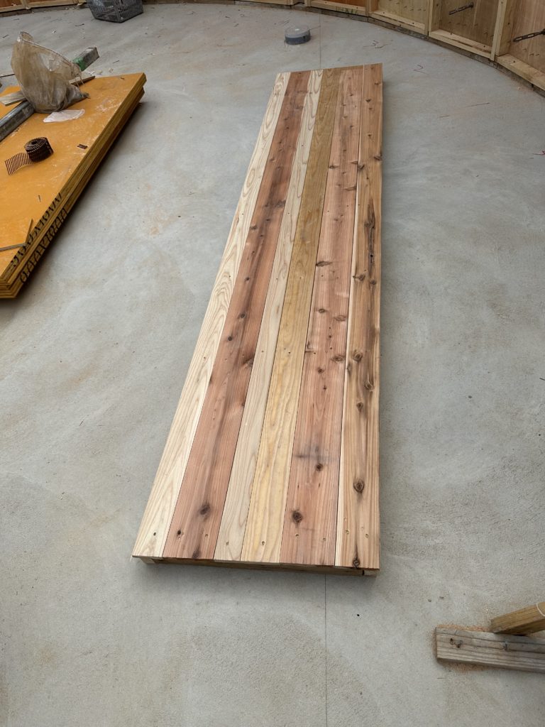 杉板の固定は、最初フィニッシュでしていましたが、杉板の反る力が強く浮いてしまうため、釘止めに変更しました。