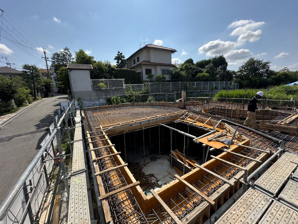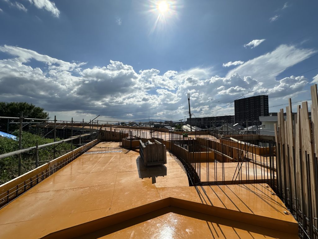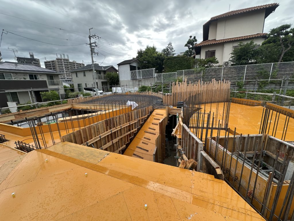スラブを貼り終えて、スラブ上の仕事も終わり、配筋中に下回りのダメをしていきます。